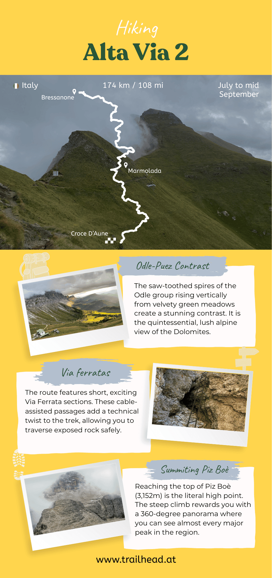 The trail runs from Brixen (Bressanone) in the north to Feltre (or the nearby Croce d'Aune pass) in the south. Brixen is a major town with excellent rail connections to international airports such as Venice (VCE), Innsbruck (INN), and Munich (MUC). Many hikers opt to take the Plose cable car from near Brixen to begin the trek, bypassing a significant initial ascent. The southern terminus at Croce d'Aune has bus services to the larger town of Feltre, from which trains and buses connect back to Venice and other major transport hubs.