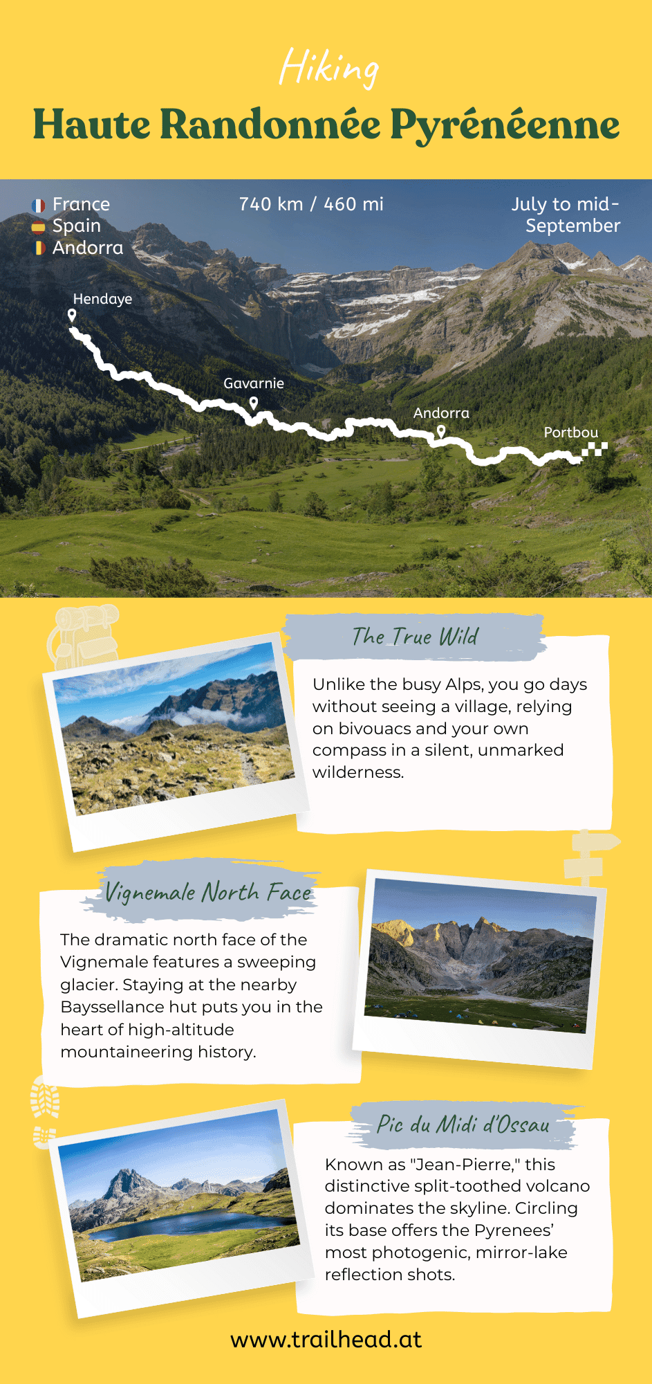 The Haute Randonnée Pyrénéenne (HRP) is the ultimate Pyrenean challenge, a high-level traverse that follows the mountainous spine dividing France and Spain. Conceived by Georges Véron in 1968, it is not a single, waymarked trail but a concept—a "walker's route" that stays as high as possible, frequently crossing the border to find the most logical and spectacular path through the mountains. This philosophy sets it apart from the more pastoral GR10 (in France) and GR11 (in Spain), which tend to follow valleys. The HRP is a journey for the experienced and self-reliant mountaineer, demanding excellent navigation skills, fitness, and a willingness to embrace solitude.