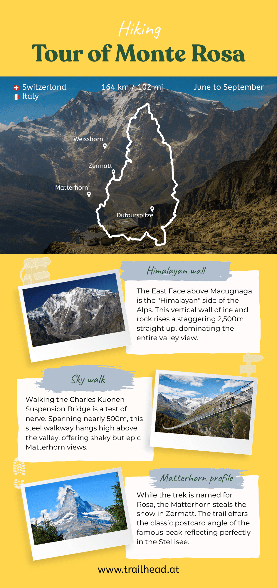 The Tour of Monte Rosa is the connoisseur's alternative to the bustling Tour du Mont Blanc. It is a wilder, tougher, and more remote journey that circumnavigates the vast, ice-clad Monte Rosa massif, the second-highest in the Alps. This trek offers a more profound sense of wilderness and solitude, taking hikers through pristine pastoral valleys and over high, demanding mountain passes that often remain in the realm of true high-altitude trekking. The scenery is defined by the raw power of rock and ice, with constant views of some of the most famous 4,000-meter peaks in the Alps, including the Matterhorn, Weisshorn, and the Dufourspitze (the highest peak in Switzerland).